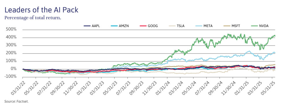 Still, AI has tested investors’ patience lately. After years of dramatic market outperformance, the share price of most members of the so-called Magnificent Seven – Amazon, Alphabet, Apple, Microsoft, Nvidia, Meta and Tesla – tumbled in recent months, as illustrated by the chart below. Though several have recovered appreciably, investors are clearly looking for a payoff.